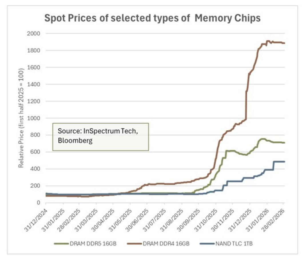A current example of this involves 3 companies producing a sophisticated form of technology that physically might seem to be the polar opposite of commodities that you dig out of the ground, but nonetheless can trade in a very similar manner to physical commodities – memory chips. Many of the NAND and DRAM memory chips produced by Samsung Electronics, SK Hynix, and Micron (which collectively dominate the market for DRAM and NAND) are interchangeable with each other, and it is therefore possible to observe the spot price for these chips on a daily basis.