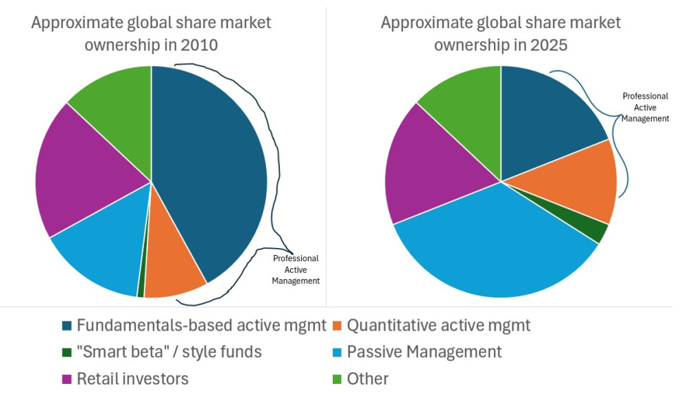 The important point I see here is that the flow of money out of active into passive has come mainly out of professional fund managers who make qualitative decisions based on fundamental research. In contrast, I believe that the proportion of the market managed according to quantitative approaches has increased, and hence the proportion of actively managed funds being managed according to quantitative approaches has increased significantly.
