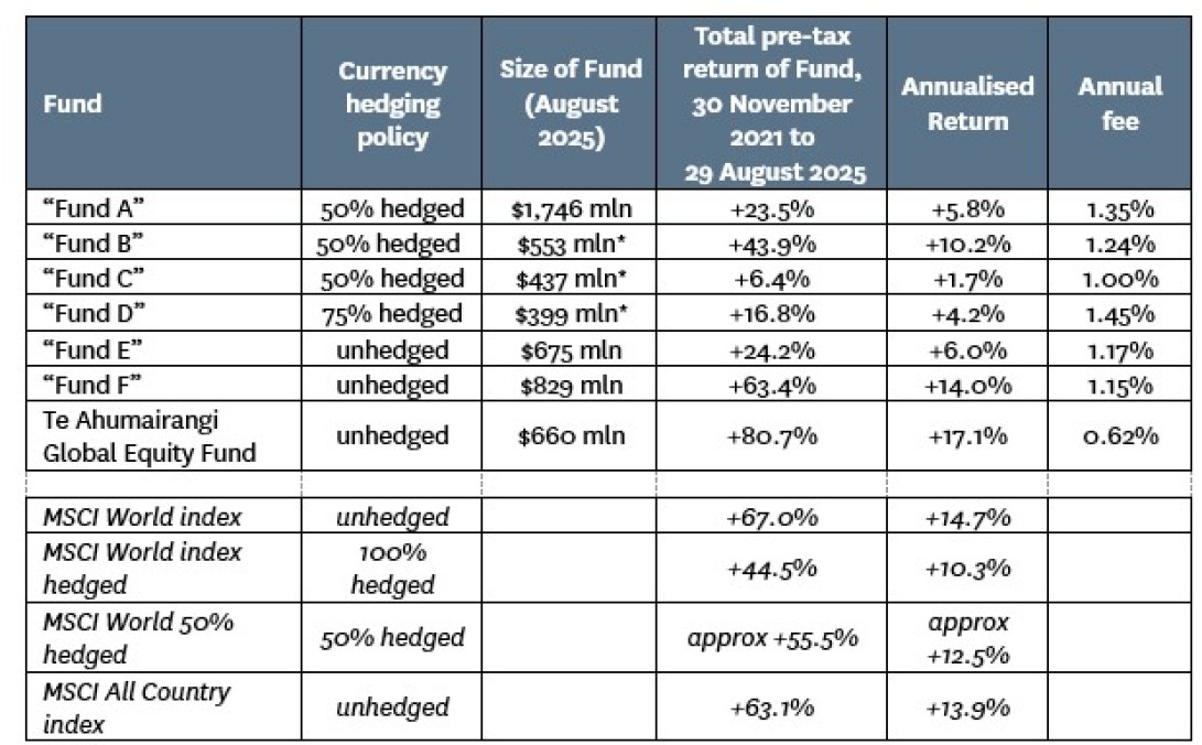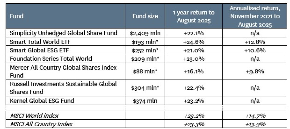 Source: Disclose Register filings, Fund fact sheets, investment manager websites, MSCI, Bloomberg. Asterisked (*) fund sizes are as at 30 June 2025 (as no fund size disclosed for August 2025).